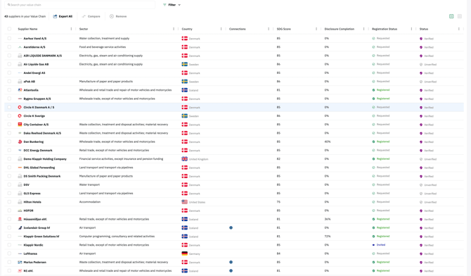 - Look for your suppliers in My Value chain who have automatic Data connections activated. They will appear with a blue dot in the Connection column. Read all about activating Data Connections